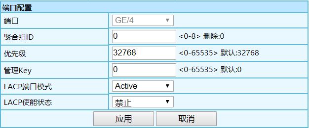 端口的 LACP 使能状态: 使能:开启端口的 LACP。 禁止:关闭端口的 LACP。注:端口默认为禁止状态。 |
